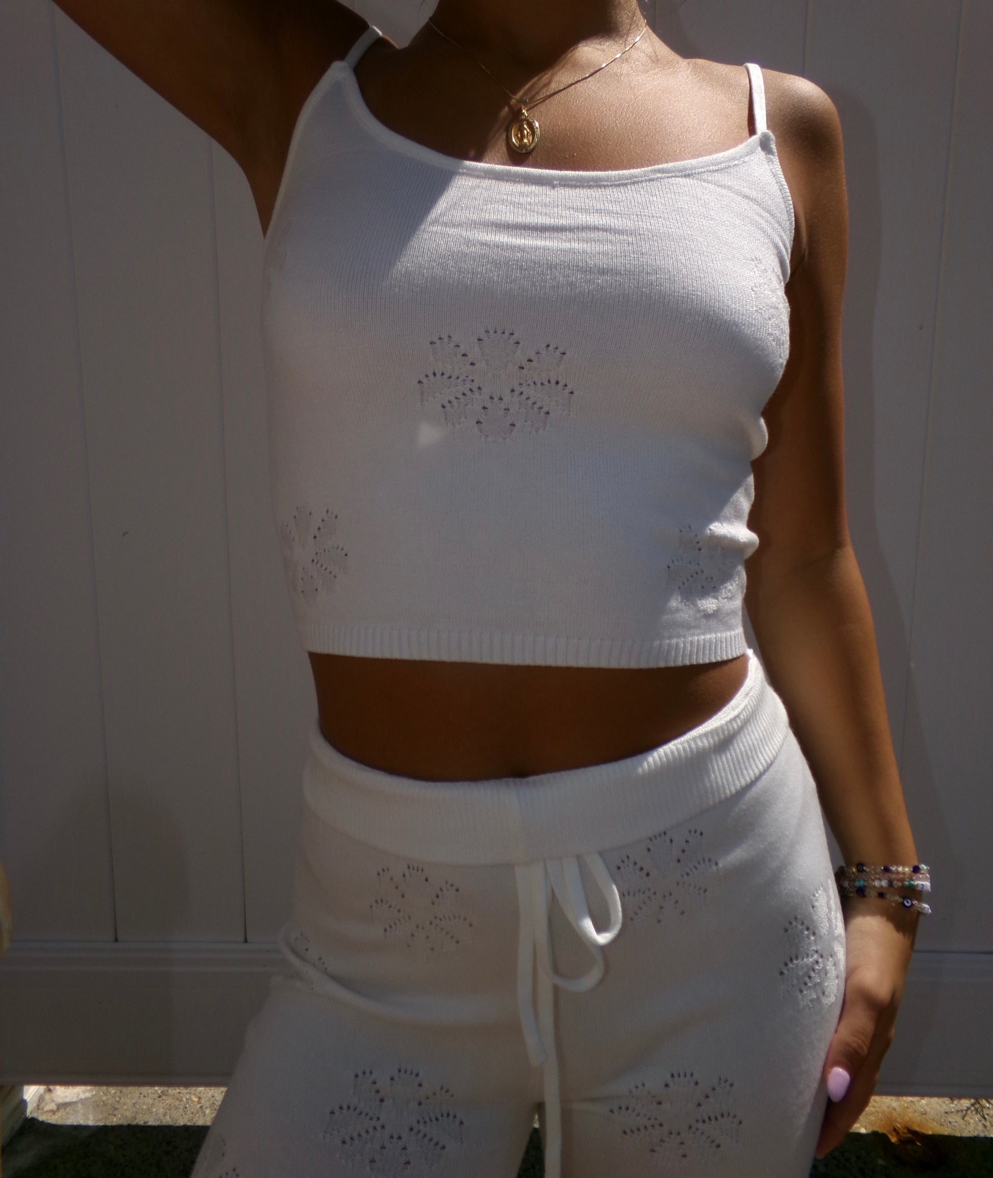 This lightweight knit set features a cropped camisole top with delicate spaghetti straps and matching wide-leg drawstring pants. Designed with daisy-inspired open-knit detailing, it adds a playful yet chic touch to a classic all-white look. Perfect for travel, lounging, or warm summer days, the soft knit fabric keeps you comfortable while the breezy silhouette gives effortless style.