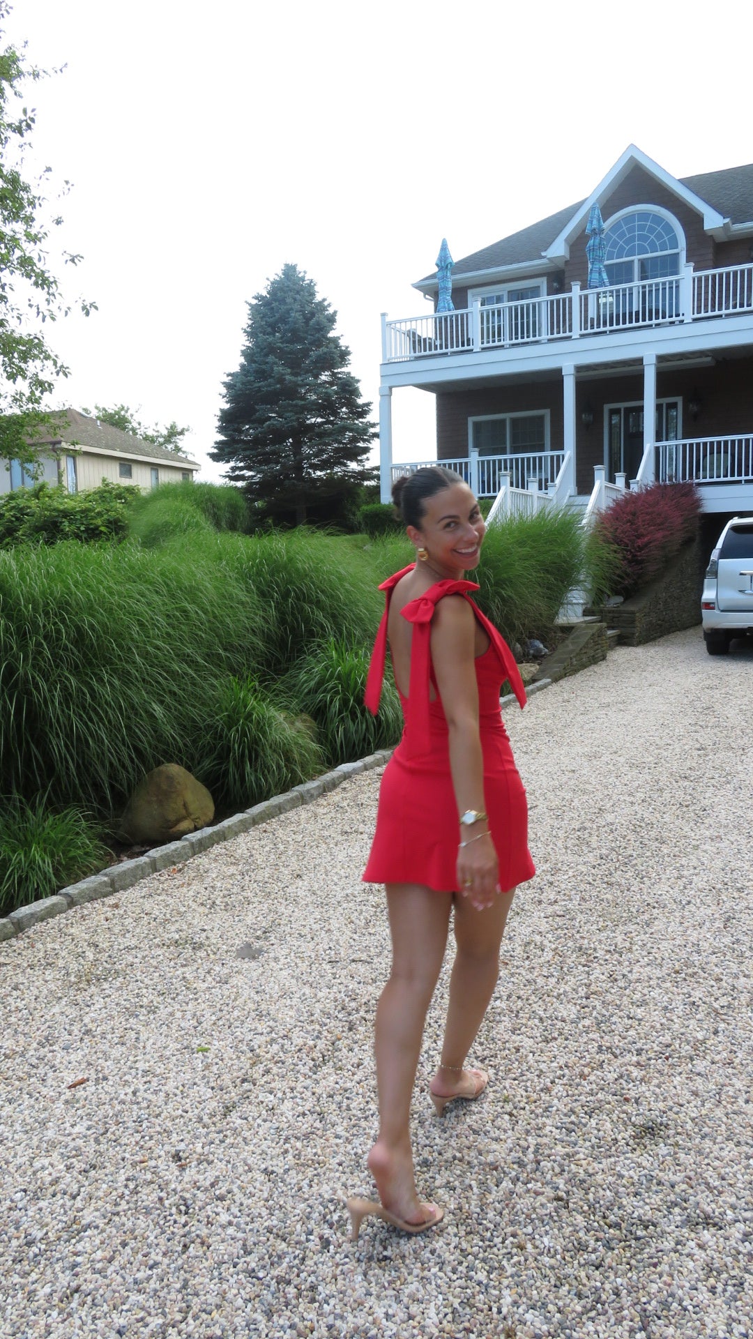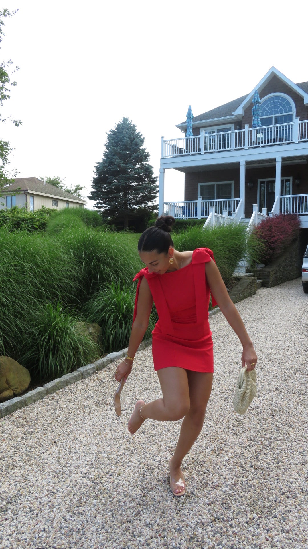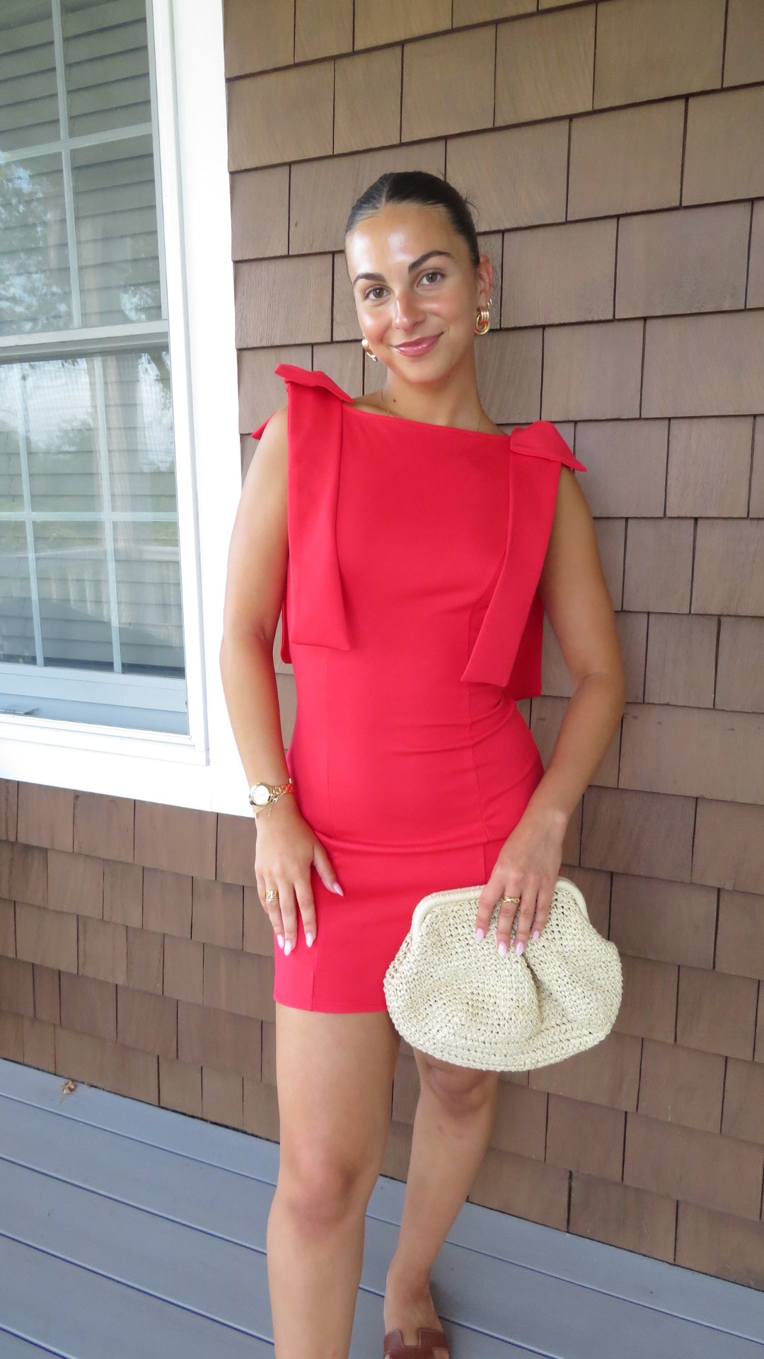 Bold yet timeless, this vibrant red mini dress is made to turn heads. Featuring a sleek, structured silhouette and feminine bow details on the shoulders, it’s the perfect mix of confidence and charm. The wide boat neckline and open back add a touch of drama, while the smooth, flattering fit hugs in all the right places. Whether you're heading to a summer soirée or a night out by the water, this dress brings the perfect balance of elegance and edge.