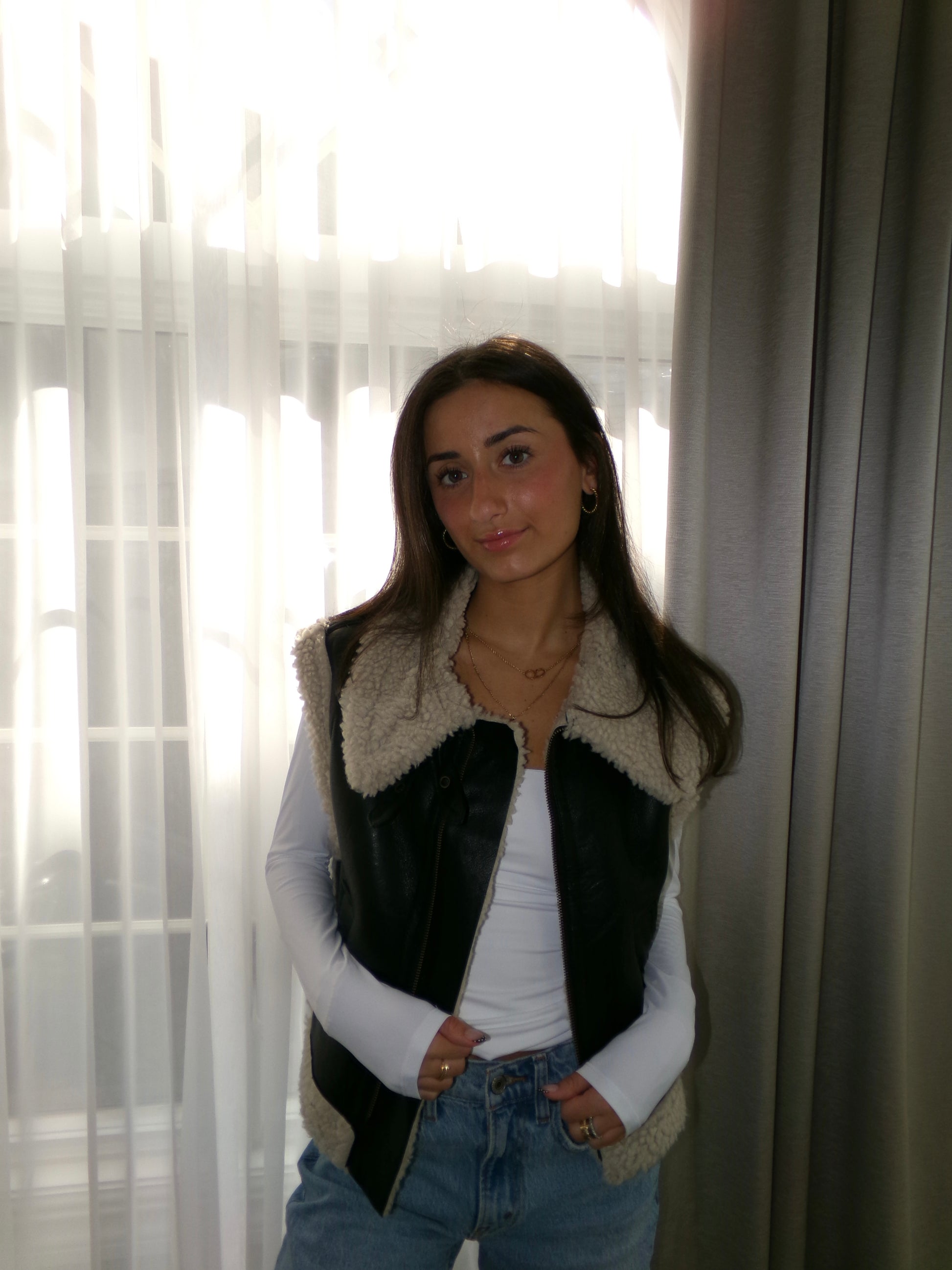 This vest combines the warmth of plush lining with the structure of smooth faux leather. Finished with a high collar and buckle accents, it’s a versatile layer that elevates everyday fall looks from denim to knits.