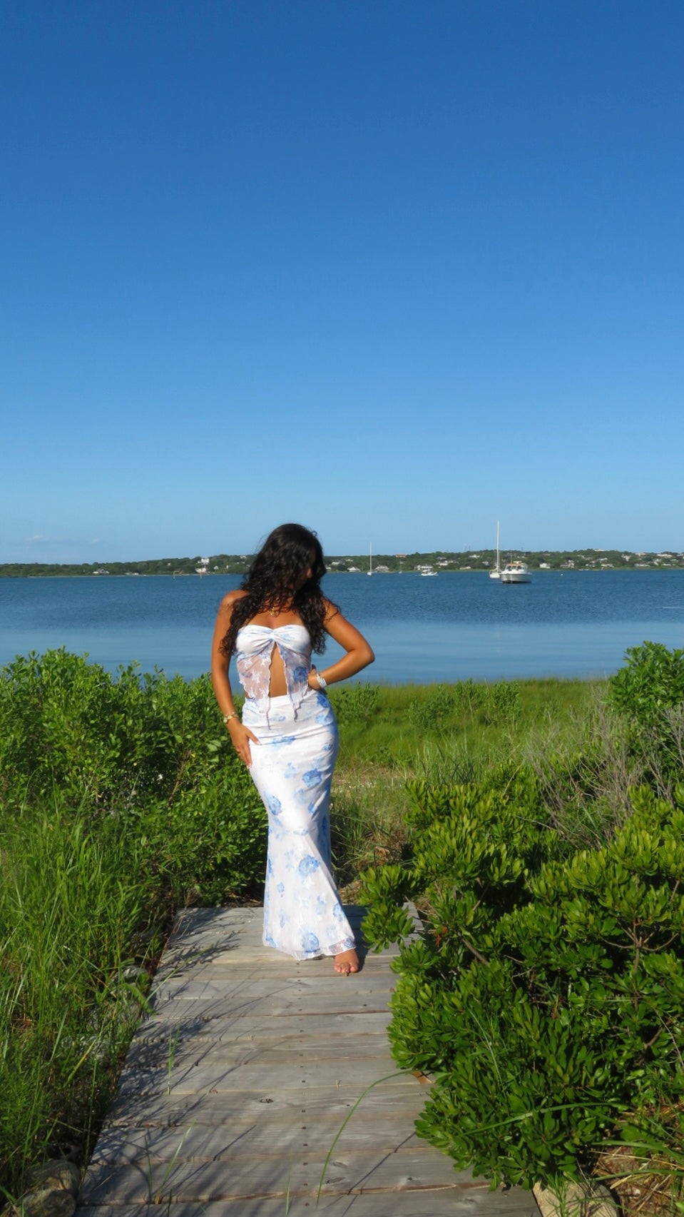 Soft, romantic, and made for golden hour. This two-piece set features a strapless tie-front top with sheer lace panels and a matching high-waisted maxi skirt in a delicate blue floral print. The lightweight, stretchy fabric hugs in all the right places while still feeling effortless. Perfect for coastal dinners, sunset strolls, or your next getaway.
