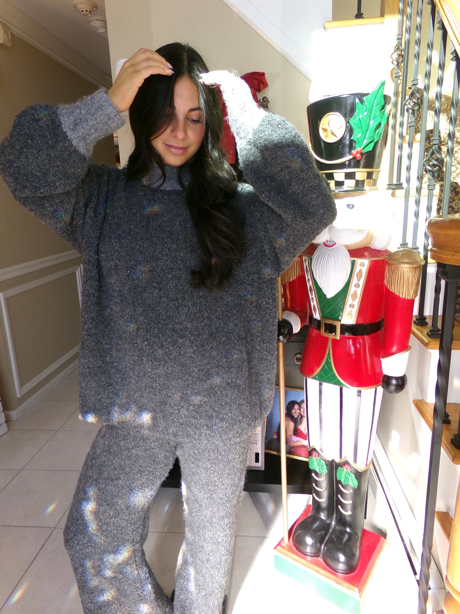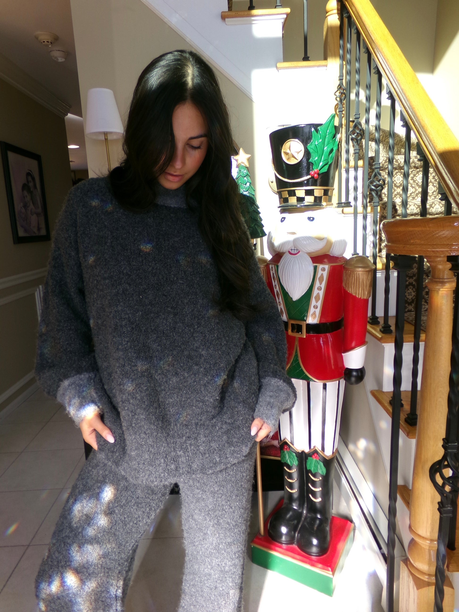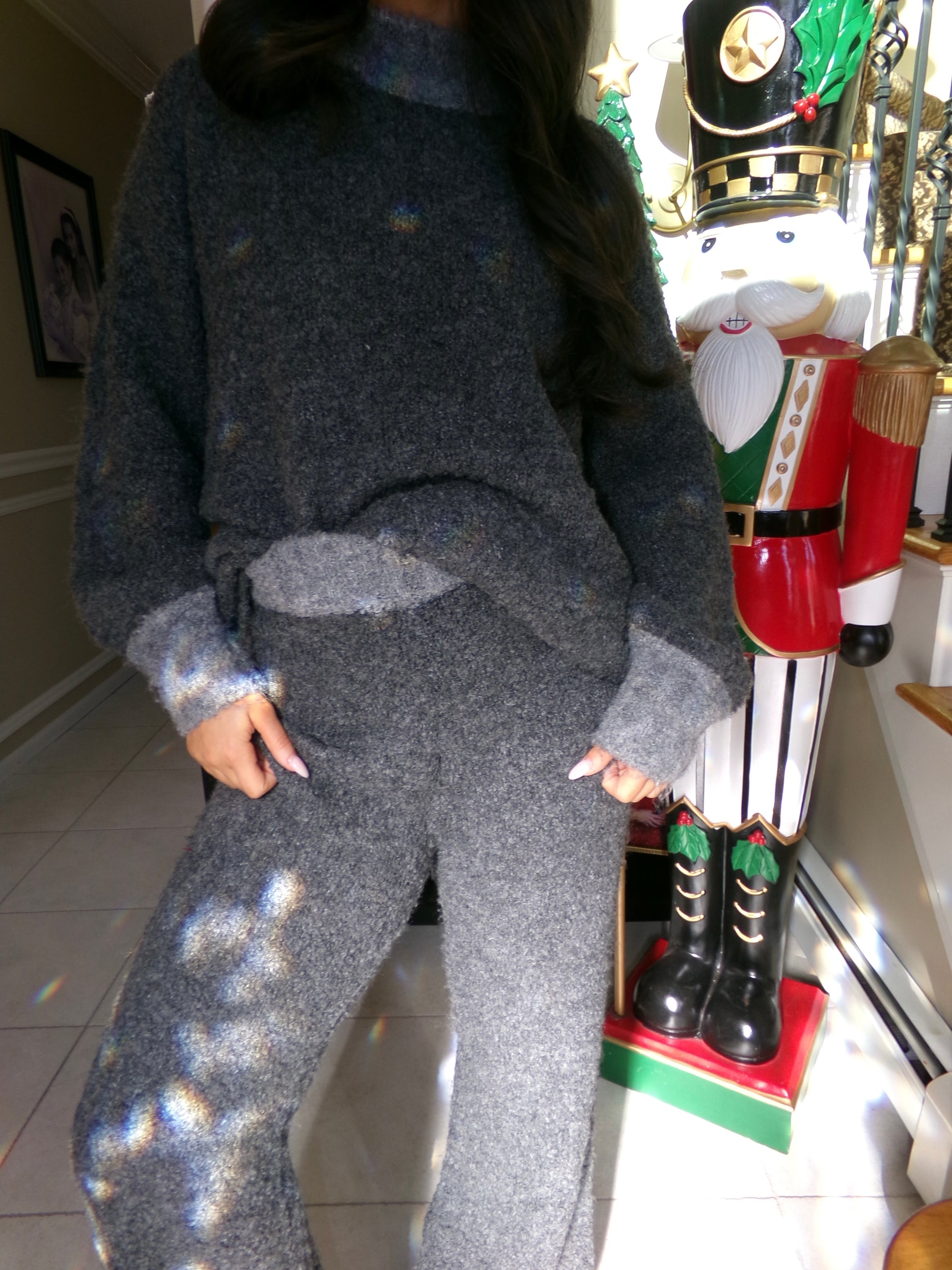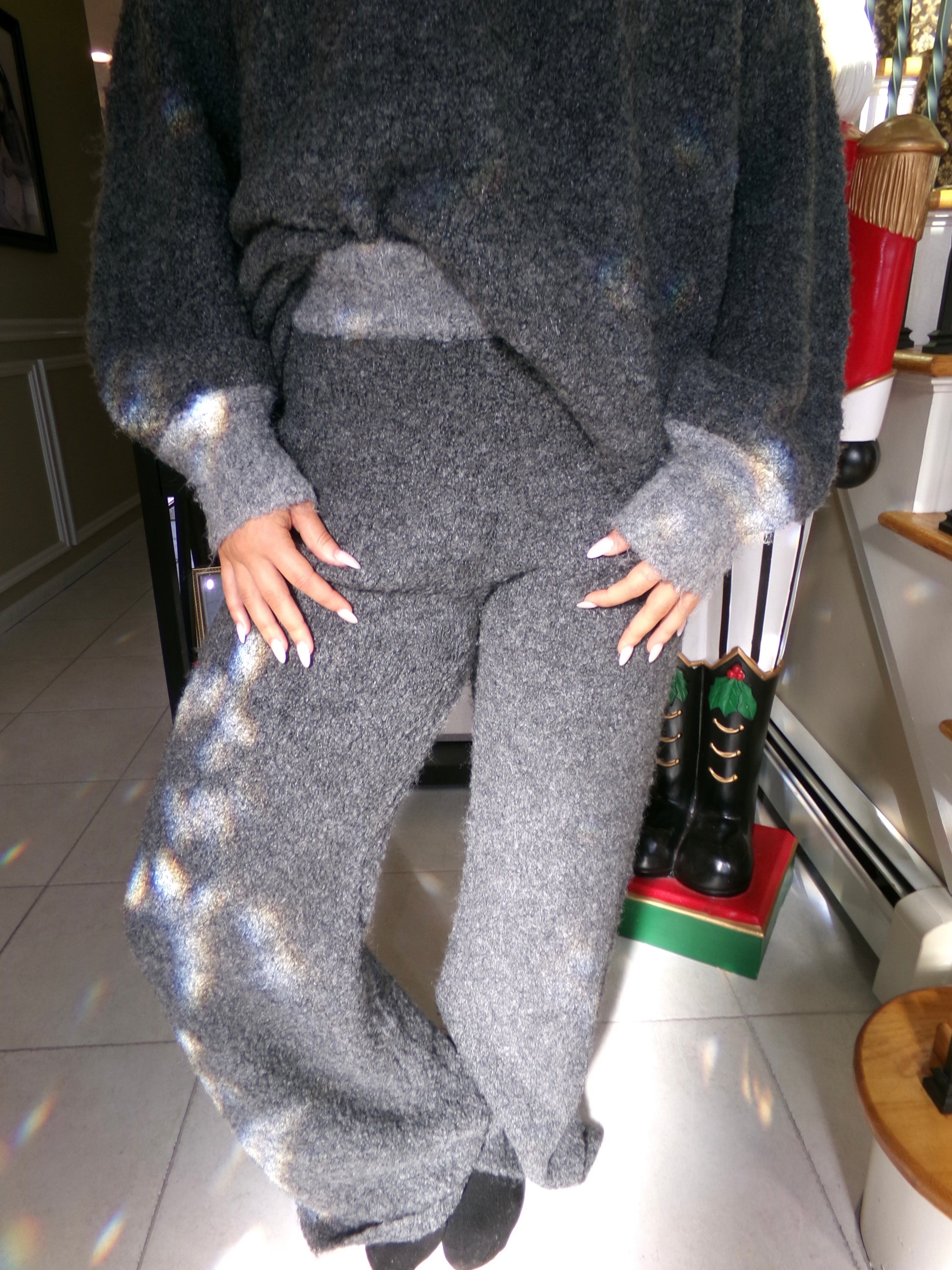 A plush, ultra-soft lounge set made for peak cozy days. The oversized knit top features a relaxed silhouette with gently dropped sleeves, giving it that effortless, slouchy look. Paired with matching wide-leg pants crafted from the same fuzzy, cloud-like fabric, the set feels warm, breathable, and luxuriously comfortable. Minimal, modern, and perfect for winter lounging, travel days, or elevated off-duty style.